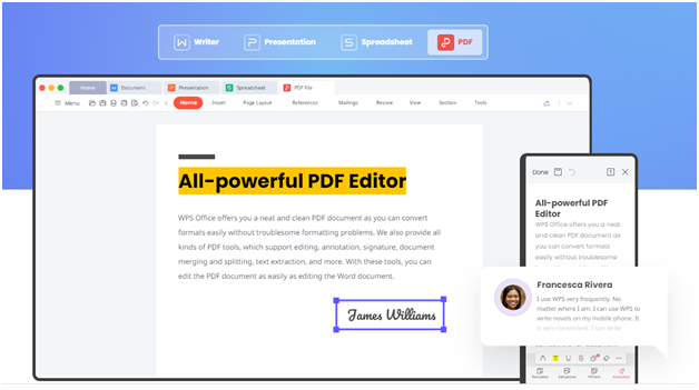 WPS Office allows users to create PDF documents using WPS Writer, WPS Spreadsheets and WPS Presentation. This feature is beneficial for those who want to preserve the layout and formatting of their content while ensuring that your documents appear identical across different devices.